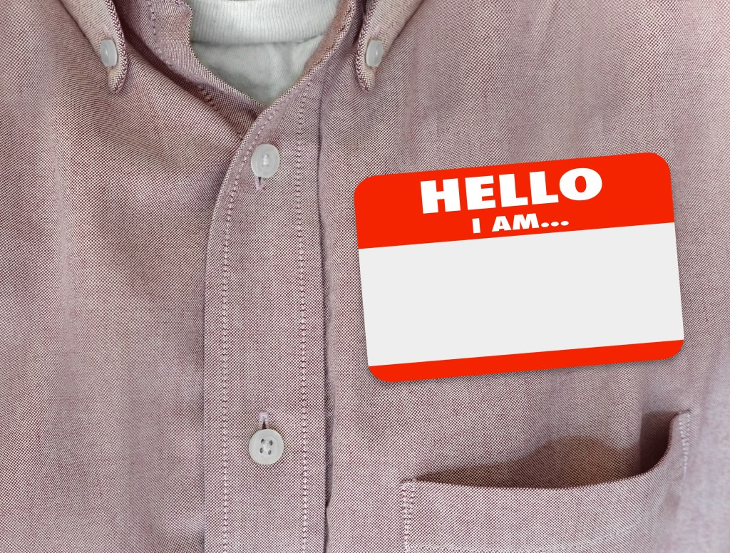 Hello I Am blank name tag worn by person in red button shirt
